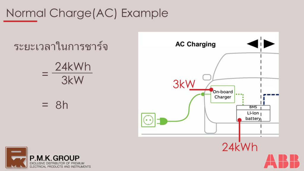 ยกตัวอย่างเช่น รถยนต์ไฟฟ้าที่มีแบตเตอรี่รถยนต์ขนาด 24 KWh และมี On Board Charger ขนาด 3KW ระยะเวลาในการชาร์จจะอยุ่ที่ 8 ชั่วโมง
