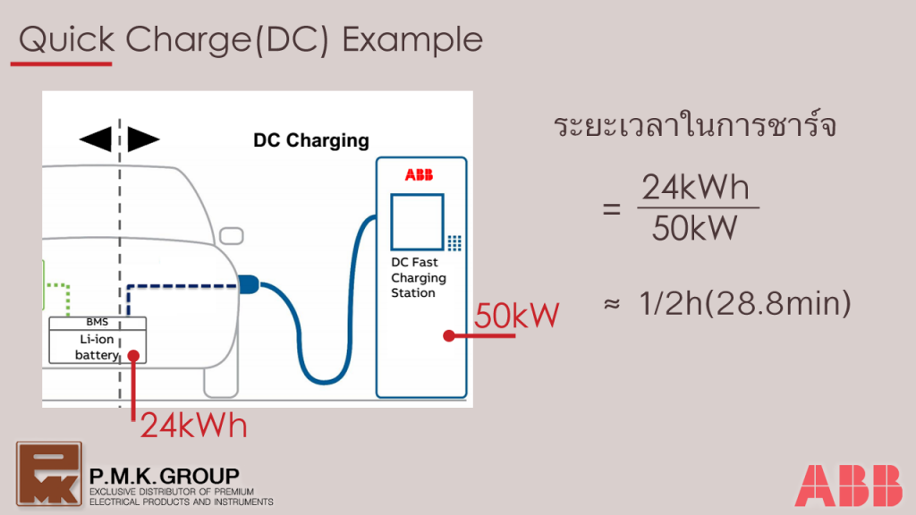 ยกตัวอย่างเช่น รถยนต์ไฟฟ้าที่มีแบตเตอรี่รถยนต์ขนาด 24kWh โดยใช้ตู้ EV Charger แบบ Quick Charge ที่มีกำลังชาร์จอยู่ที่ 50kW ระยะเวลาในการชาร์จจะอยู่ที่ไม่เกิน 1/2 ชั่วโมง